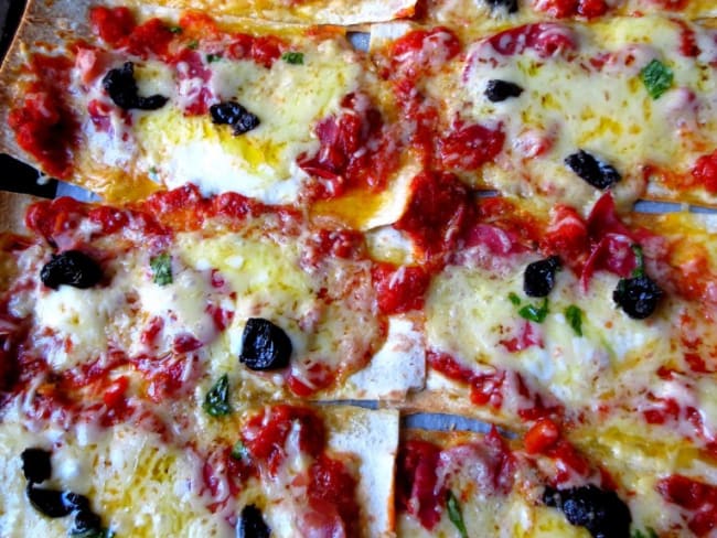1 paquet de pain lavash 1 boîte de tomates italiennes en cubes ou une sauce toute prête bio 1 pincée dorigan Quelques feuilles de basilic frais Des olives noires Mozzarella. Lavash arménien - 2 pcs. Beurre ramolli 2 cuillères à soupe.